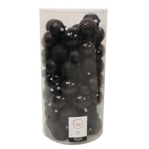 De Kerstballen Mix 100 st. - Zwart van Buitengewoon Boet bestaat uit een mix van 100 verschillende kerstballen in de kleur: zwart.