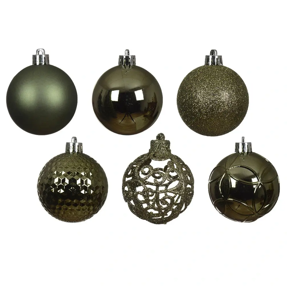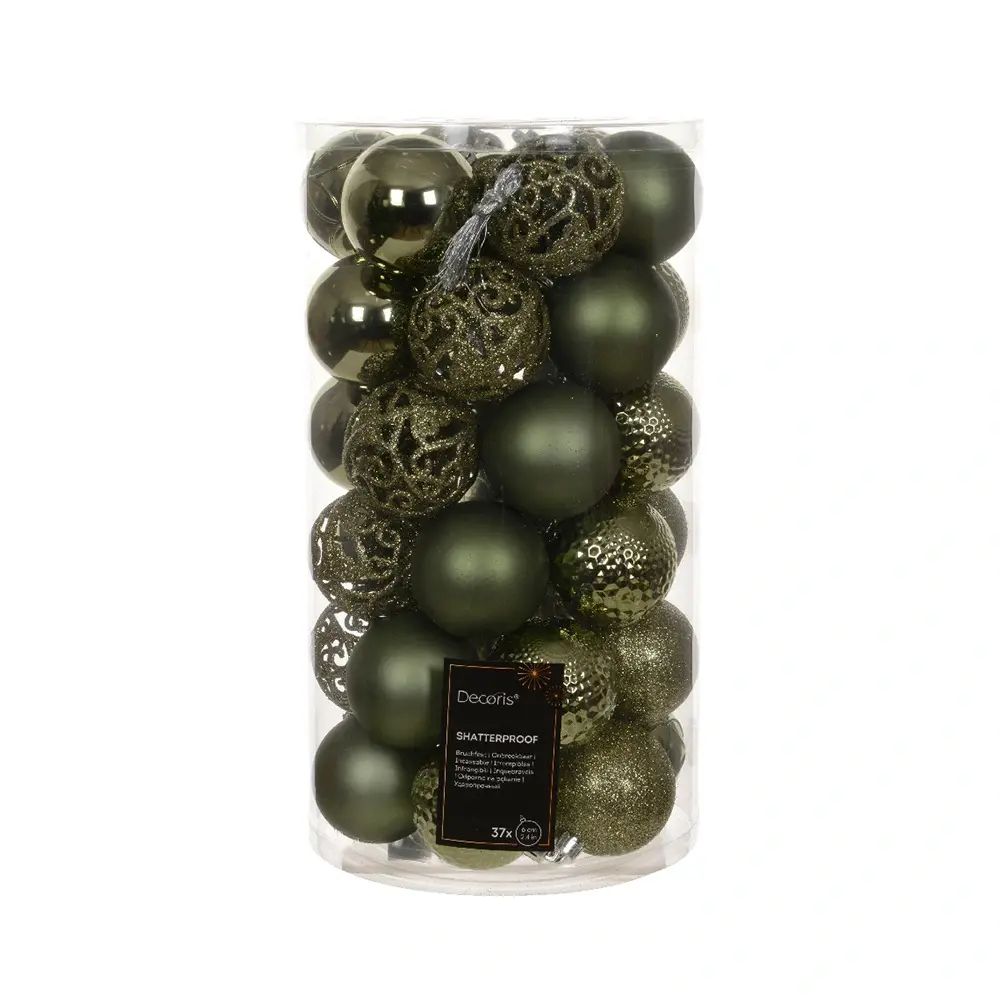 Een verpakking bevat 37 kerstballen in verschillende formaten en dessins. In de koker zitten glanzende, matte en glitter kerstballen.