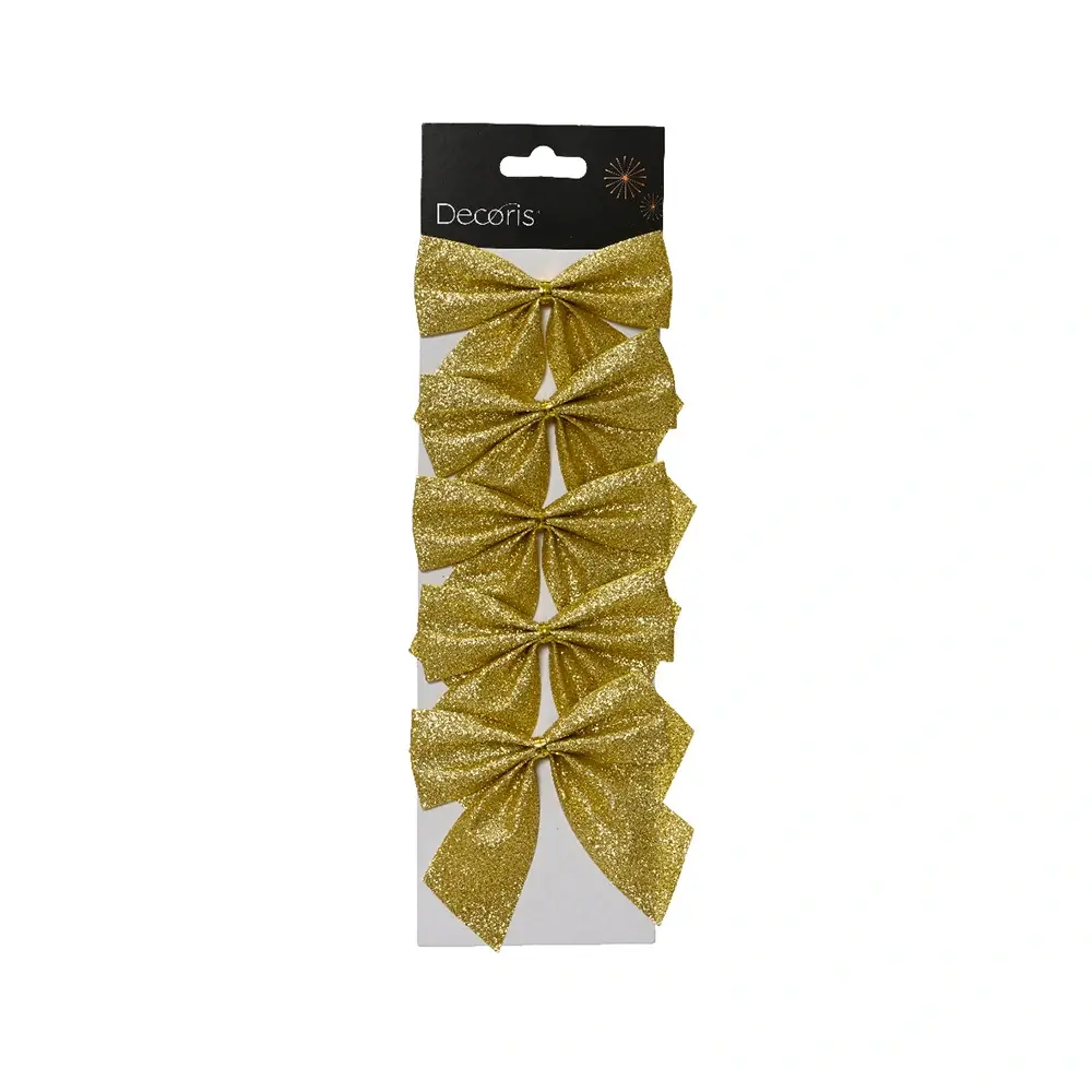 De Kerstboom Strik Glitter Licht Goud - 5 st. van Decoris is gemaakt van polyester en is goud van kleur. Hang meerdere strikken in de boom voor een feestelijk effect. De verpakking bestaat uit 5 strikken.