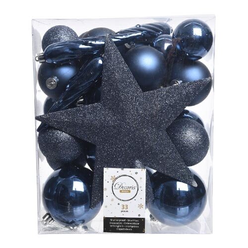 Een verpakking bevat 33 stuks plastic kerstballen én een ster piek. De kerstballen hebben verschillende formaten in glans, mat en glitter en hebben een donkerblauwe kleur.