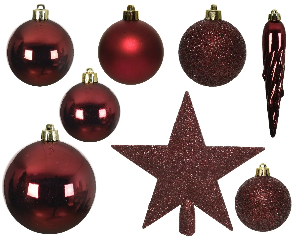 Een verpakking bevat 33 stuks plastic kerstballen én een ster piek. De kerstballen hebben verschillende formaten en zijn er in glans, mat en glitter.
