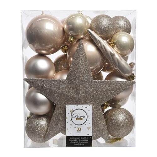 Een verpakking bevat 33 stuks plastic kerstballen én een ster piek. De kerstballen hebben verschillende formaten en zijn er in glans, mat en glitter.