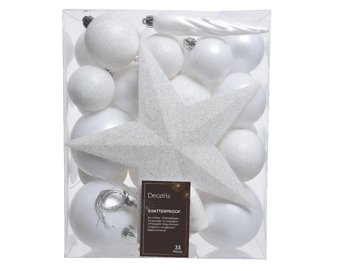 Een verpakking bevat 33 stuks plastic kerstballen én een ster piek. De kerstballen hebben verschillende formaten en zijn er in glans, mat en glitter.