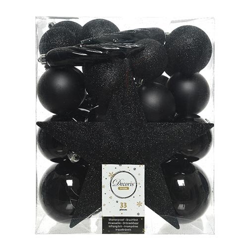 Een verpakking bevat 33 stuks plastic kerstballen én een ster piek. De kerstballen hebben verschillende formaten in glans, mat en glitter en hebben een zwarte kleur.