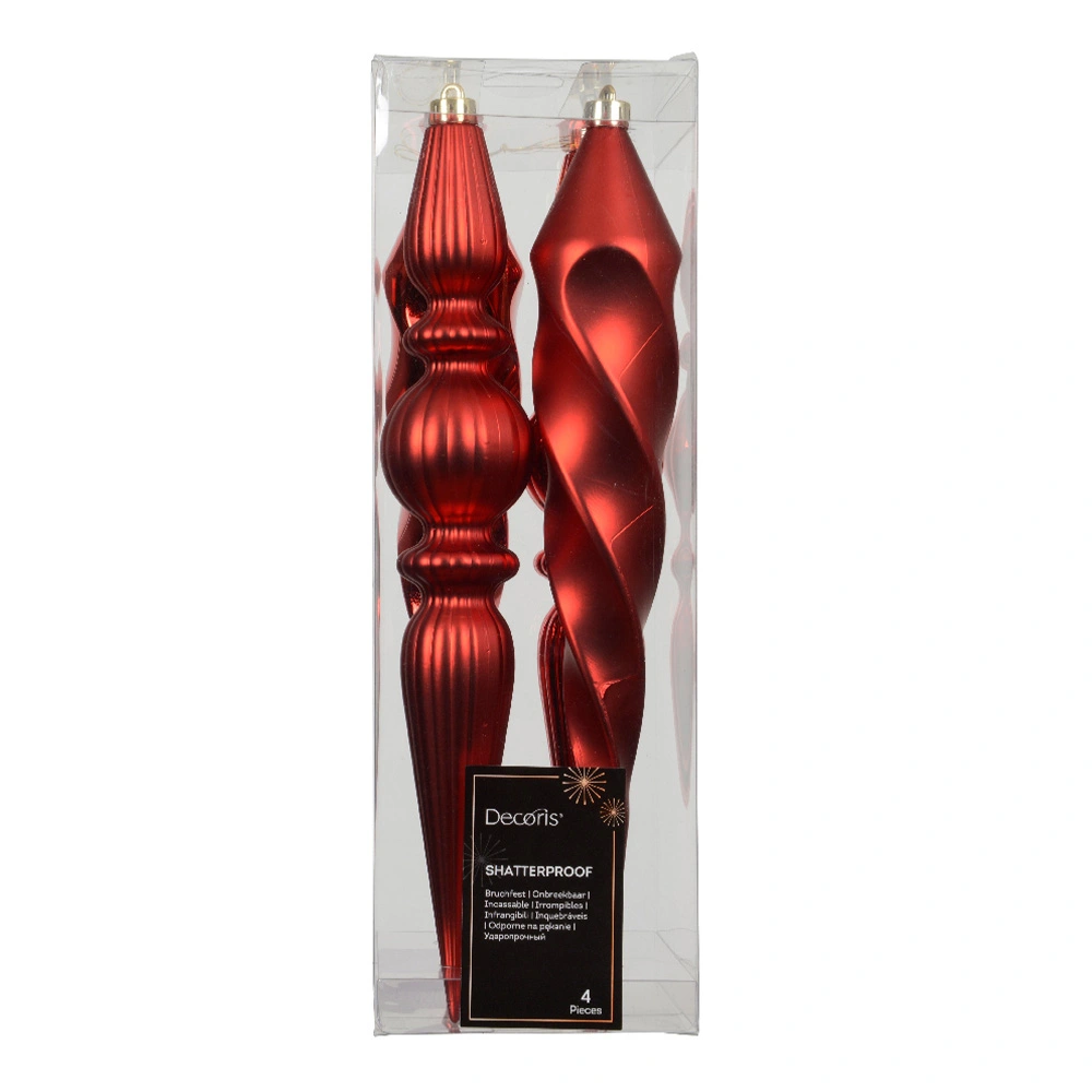 Creëer een unieke kerstboom met de Kersthangers Ijspegel 4 st. - Kerstrood van Decoris! Deze plastic kersthanger is een echte eyecatcher in de boom. De kersthanger is gemaakt van kunststof en dus ook veilig voor kinderen en huisdieren. In de verpakking zitten 4 ijspegels, zowel met glans als mat.