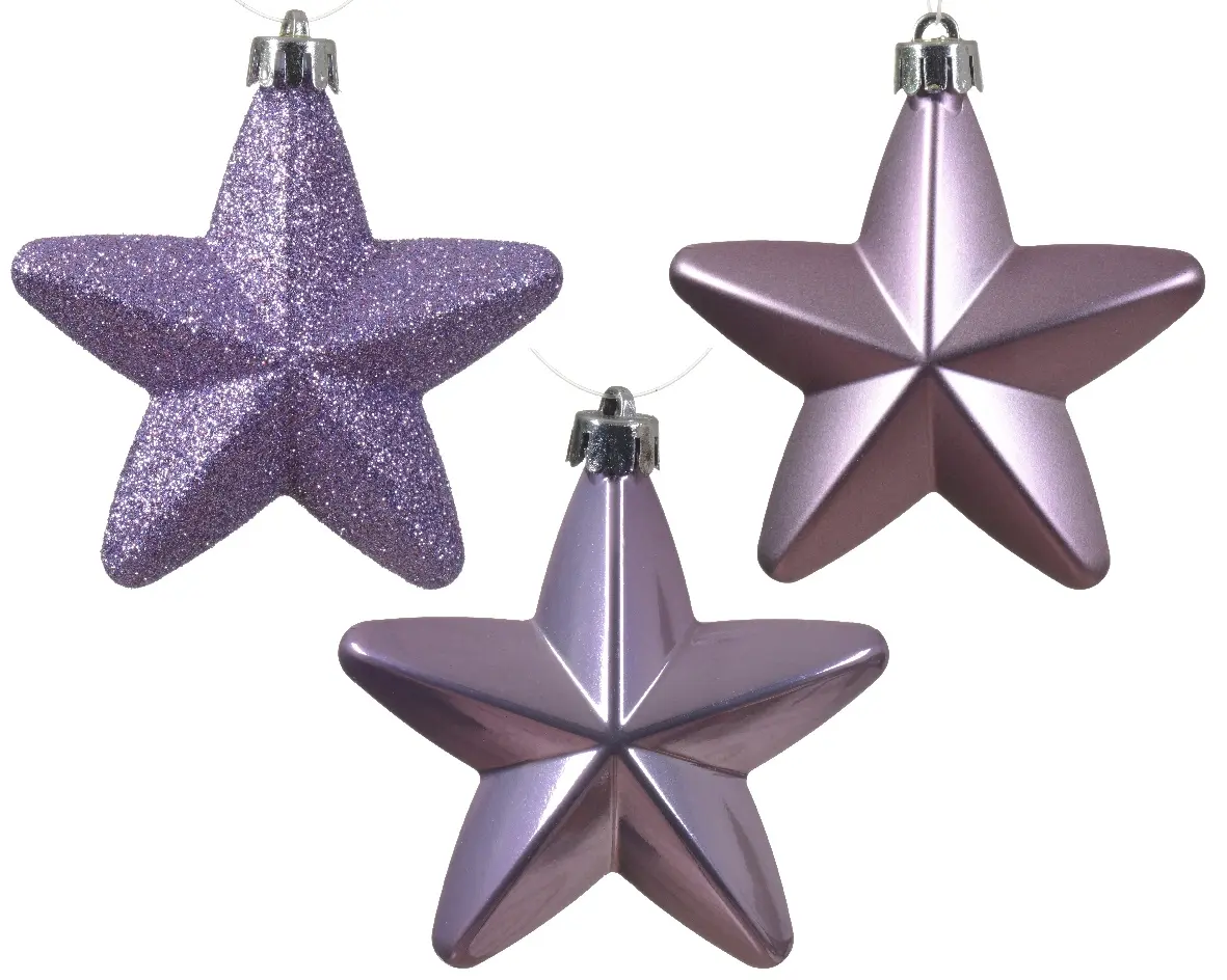 De verpakking bevat een mix van 2x mat, 2x glans en 2x glitter kerststerren. De sterren zijn paars van kleur.