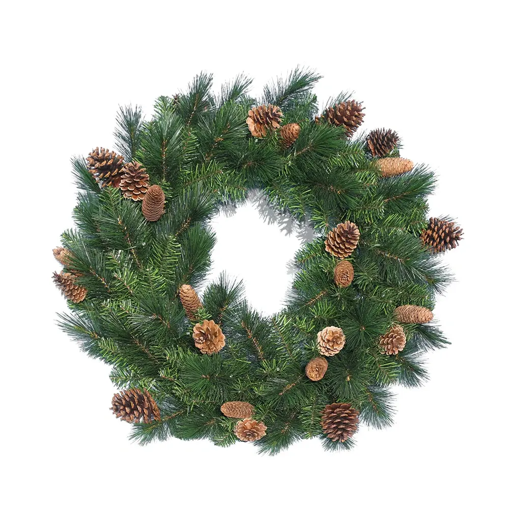 De naalden van de Kunstkerstkrans Pine Ridge met Dennenappels - Ø76 cm hebben een mooie groene kleur en zijn voorzien van dennenappels. De takken van deze kunstkerstkrans hebben een ronde vorm en zijn van een stevige kwaliteit waardoor de krans mooi strak is vormgegeven. Je kunt de kerstkrans zelf verder decoreren met verlichting en kerstversiering.