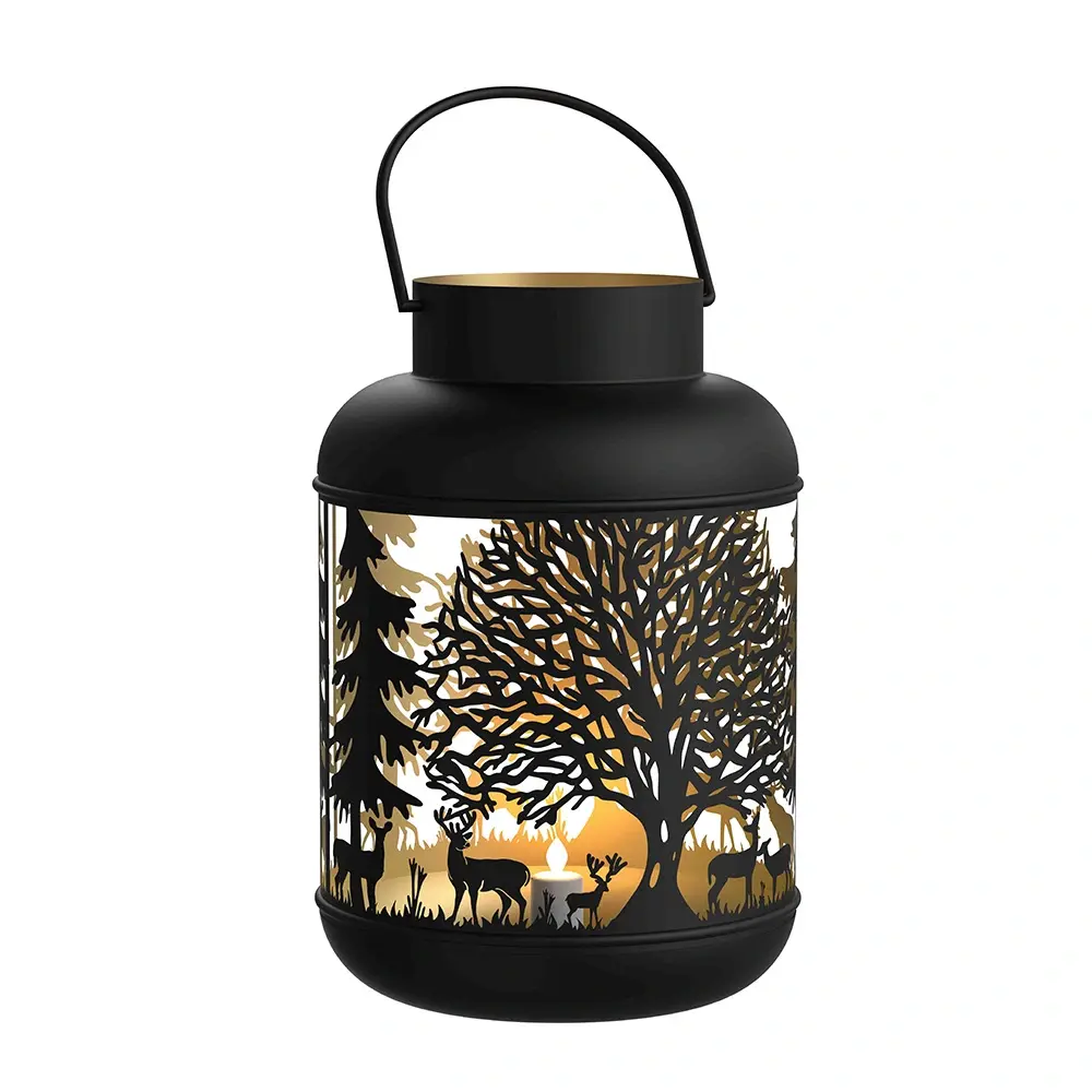 De lantaarn is voorzien van een mooi patroon met hertjes en bomen.