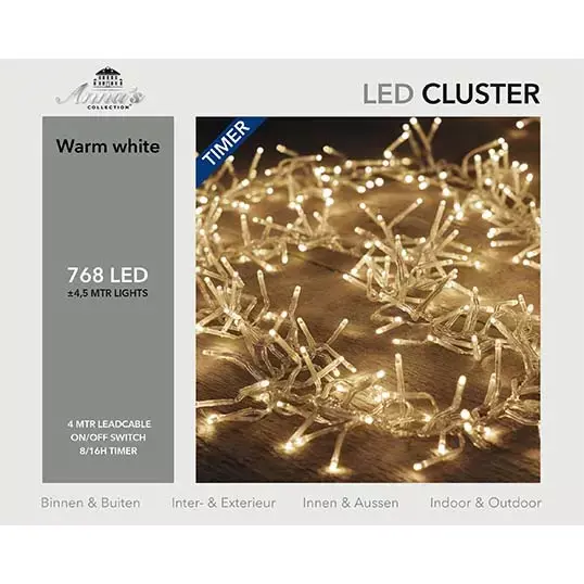 Heel veel lichtjes bij elkaar! De LED Clusterverlichting 4,5 m van Anna's Collection is voorzien van maar liefst 768 LED lampjes aan een transparant snoer van 4,5 meter lang. De lampjes geven een warm wit licht af.