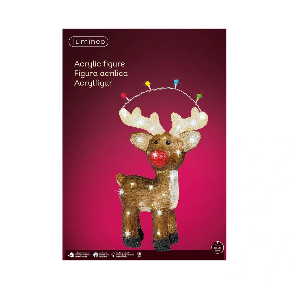 Laat je tuin stralen met de LED Hert Acryl - 47 cm van Lumineo! Dit verlichte hert is gemaakt van PET kunststof en is voorzien van 48 LED lampjes die een mooi koel wit licht met flash effect afgeven.