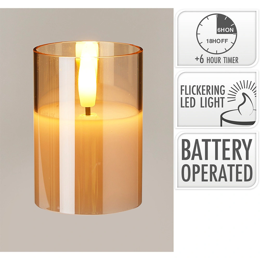 Met LED Kaars in Glas Licht - 7 cm maak je het direct gezellig in huis. De glazen LED kaars van 7 cm combineert stijlvol design met warm licht. De verlichting is in te stellen met een 6h/18h timer.. De LED kaars creëert een warme, knusse sfeer zonder open vuur en is een sfeervol en veilig alternatief voor echte kaarsen.