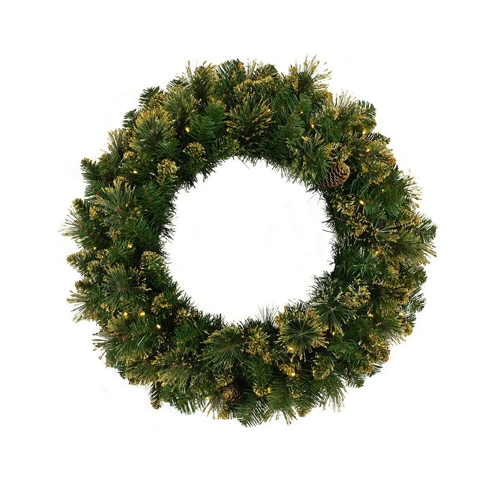 De naalden van de LED Kunstkerstkrans Golden met Dennenappels - Ø76 cm hebben een mooie groen met gouden kleur en zijn voorzien van dennenappels en LED verlichting. De takken van deze kunstkerstkrans hebben een ronde vorm en zijn van een stevige kwaliteit waardoor de krans mooi strak is vormgegeven. Je kunt de kerstkrans zelf verder decoreren met kerstversiering.