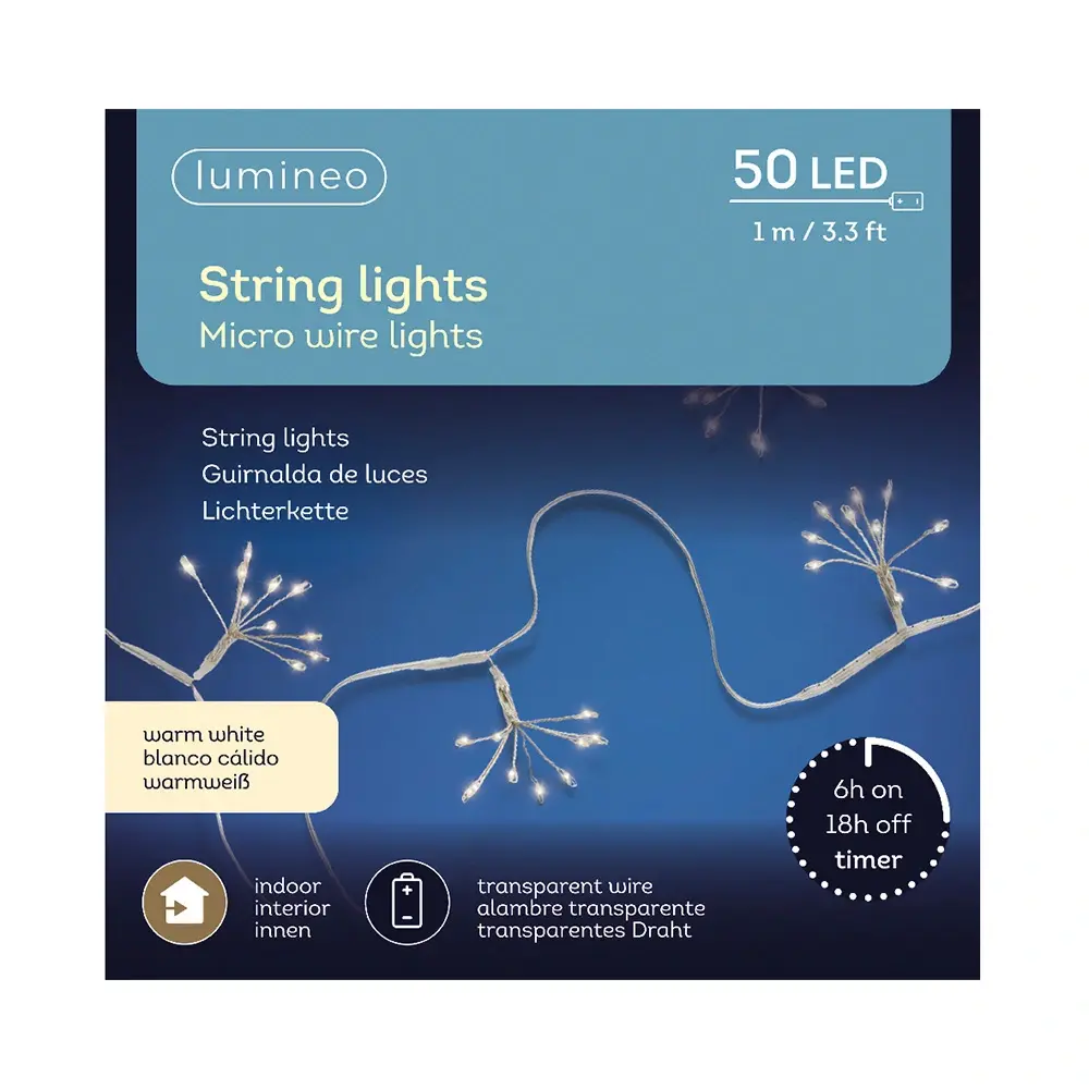 De LED Micro Draadverlichting Warm Wit - 1 m van Lumineo is voorzien van 50 LED lampjes. De lampjes geven een warm wit licht af en werken op 3x AA batterijen, welke niet zijn inbegrepen.