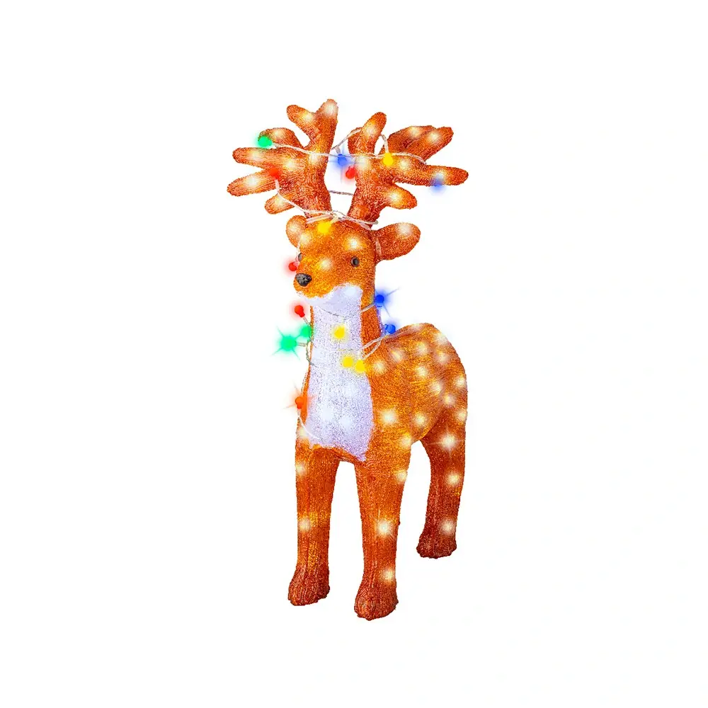 Laat je tuin stralen met de LED Rendier Acryl - 67 cm van Lumineo! Dit verlichte rendier is gemaakt van PET kunststof en is voorzien van 120 LED lampjes die mooi koel wit en gekleurd licht afgeven.