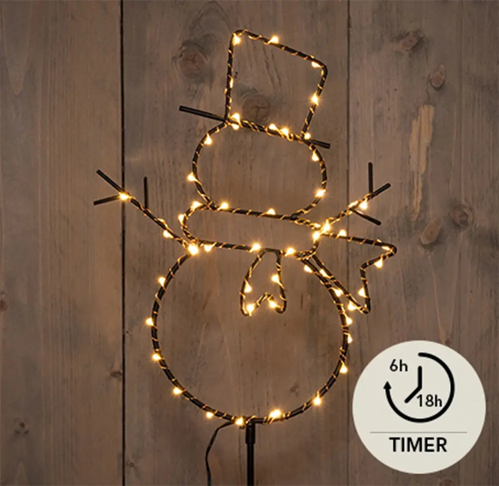 Deze prachtige LED Sneeuwpop Zwart op Steker - 23x100 cm is een opvallende kerstdecoratie die elke ruimte zal verfraaien. De ingebouwde LED-verlichting zorgt voor een warme en feestelijke gloed, waardoor het de perfecte aanvulling is op je kerstversiering. Deze sneeuwpop kan je als decoratie buiten in de grond steken en heeft een handige timer. De decoratie werkt op batterijen. Deze zijn niet inbegrepen.