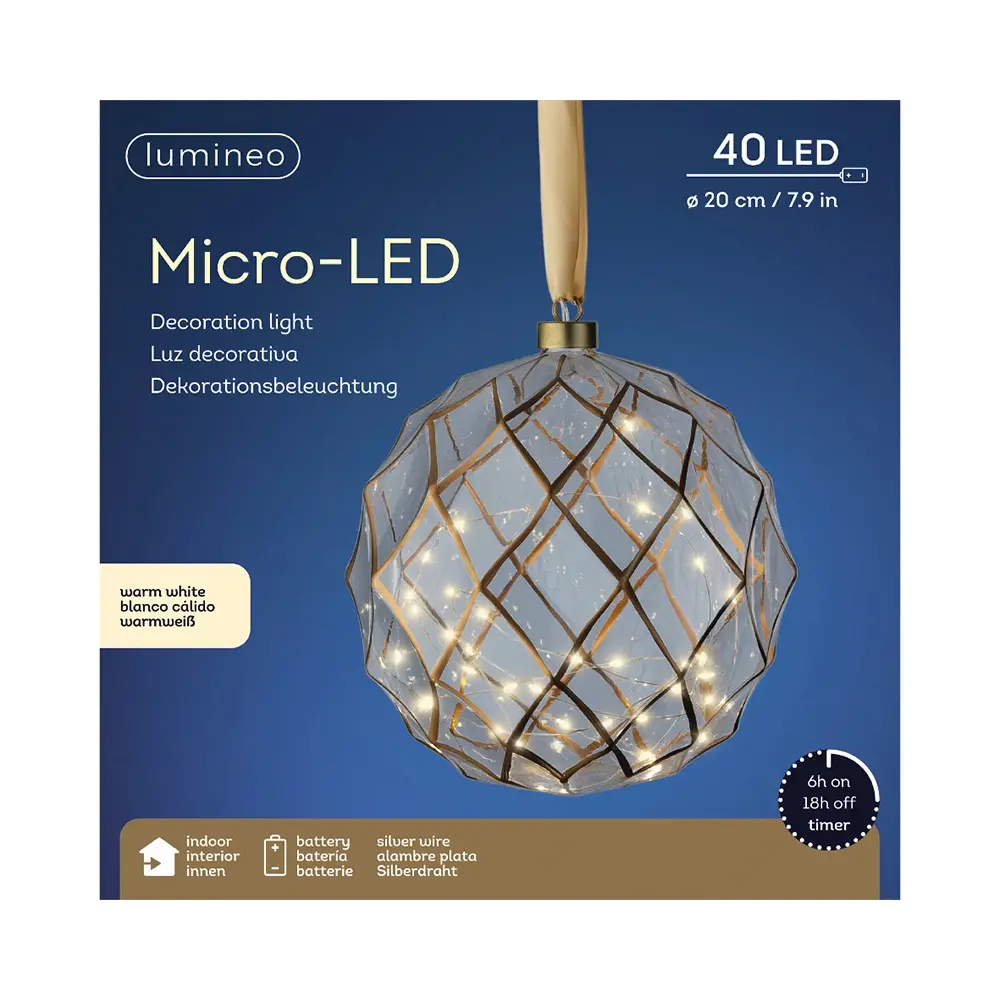 De Micro LED Bal Ruit Helder - Ø20 cm van Lumineo is voorzien van 40 LED lampjes die een warm wit licht afgeven. De verlichting is gemaakt van glas.