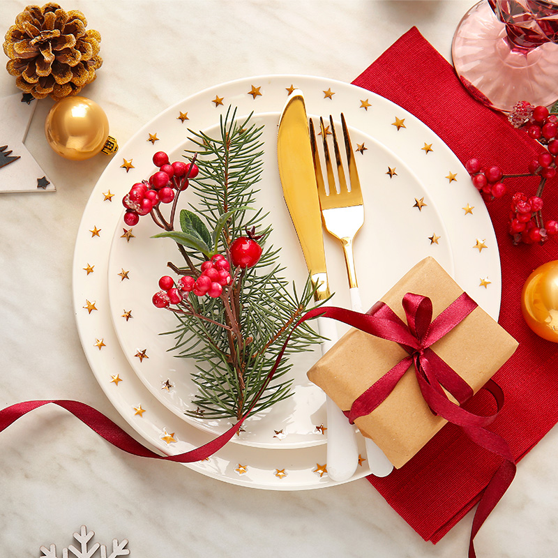 Je kunt ook een kleine kerstkrans om elk bord leggen. Een kransje van ongeveer 15 centimeter is mooi. Of leg wat losse takjes en een kerstbal naast elk bord.