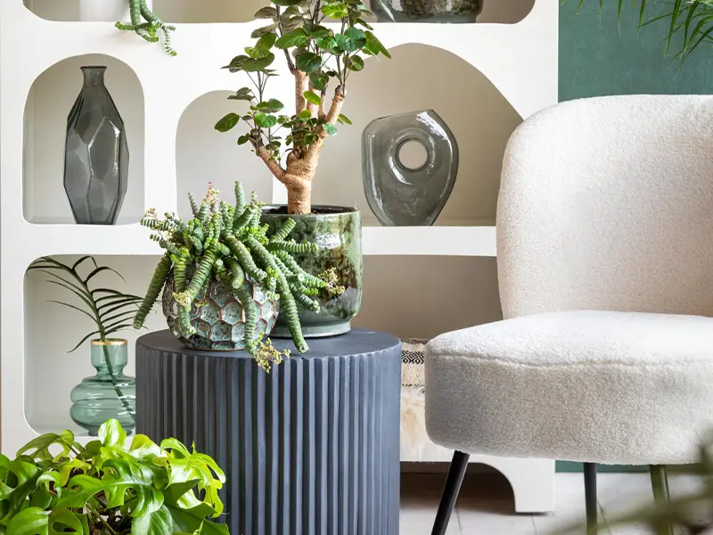 Planten horen in elk gezellig huis. Ze geven kleur, zorgen voor betere lucht en brengen rust. Grote kunstplanten in de hoek of kleine kunstbloemen op tafel. Groen werkt altijd.