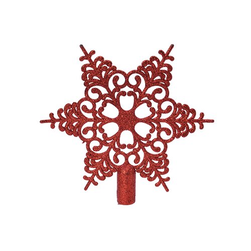 Maak uw kerstboom helemaal af met de Piek Sneeuwvlok - Kerstrood! Deze piek in sneeuwvlok vorm is rood van kleur en is voorzien van glitters. De piek is gemaakt van kunststof en is daardoor niet breekbaar zoals veel andere kerstversiering. U kunt de plastic kerstboom piek gemakkelijk bovenop de kerstboom plaatsen door de opening aan de onderkant van de piek.