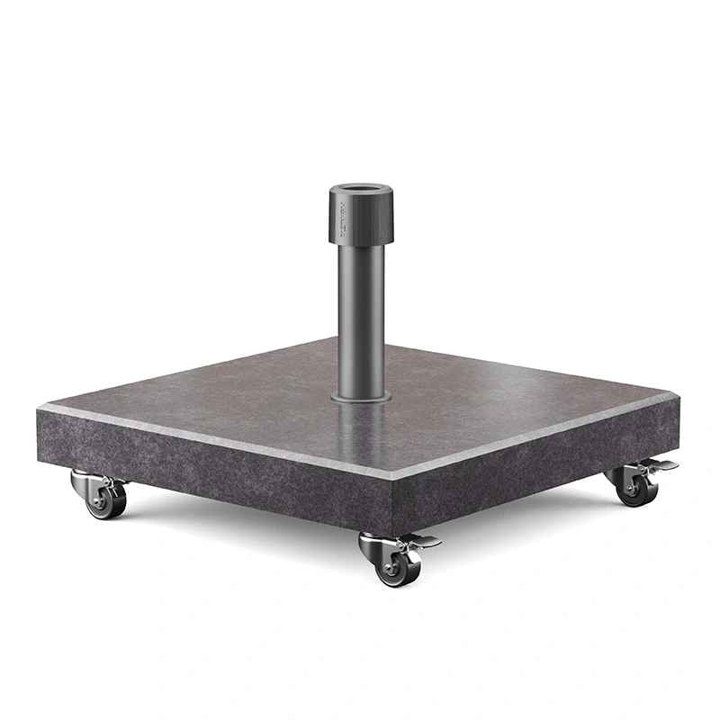De Rome parasolvoet van 60 kg is gemaakt van graniet en RVS buizen. Het graniet is zwart gepolijst waardoor de parasolvoet een luxe uitstraling krijgt. Graniet en RVS zijn duurzame, weerbestendige en onderhoudsvriendelijke materialen waardoor de Rome parasolvoet gemakkelijk buiten kan blijven staan.