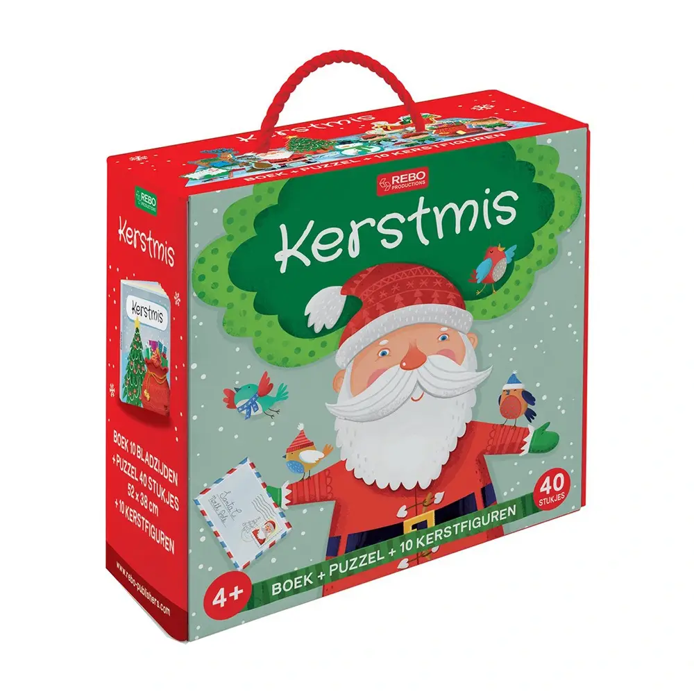 De Rebo Kerstmis Puzzel 40 st. + Boek + 10 fig. bestaat uit een boek , een puzzel van 40 stukjes en 10 kerstfiguren. en is geschikt vanaf 4 jaar.