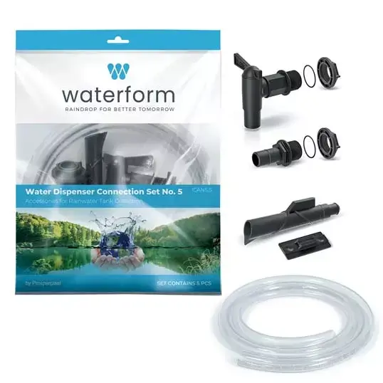 Deze 5-delige set bestaat uit een regentonkraan en een aftapslang om de ton compleet te legen.