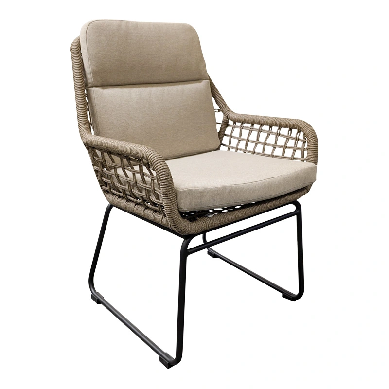 De bijpassende diningstoelen zijn een comfortabele en elegante aanvulling. Ze zijn vervaardigd uit een combinatie van aluminium en rope (gevlochten touw), wat zorgt voor een luchtige, luxe uitstraling. De zachte zit- en rugkussens in neutrale tinten bieden optimaal comfort, zodat je urenlang kunt genieten van gezellige diners en lange zomeravonden.