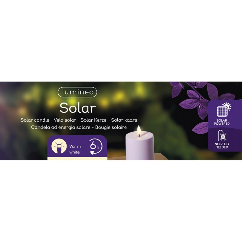 Geniet van een sfeervolle verlichting in je tuin of op je terras met deze Solar Buitenkaars Kunststof Lila - Ø7x10 cm. Deze compacte kaars van duurzaam kunststof is ideaal voor op tafel, het balkon of in de tuin. Dankzij zonne-energie laadt hij zichzelf overdag op en schakelt hij automatisch in bij schemering. Het witte LED-licht zorgt voor een rustige en warme ambiance, zonder gedoe met kaarsvet of open vuur.