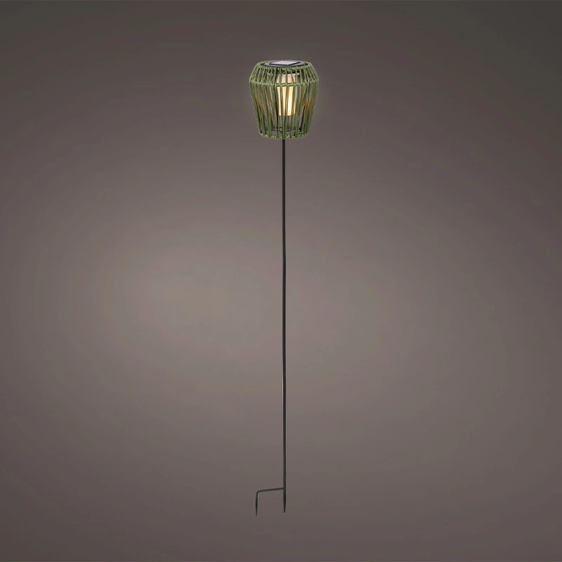 De tuinsteker is voorzien van verlichting die een realistisch en levendig vlameffect produceren. De lamp is afgewerkt in een elegant groen wicker design. De lamp is verder gemaakt van kunststof en metaal. Dankzij de werking op zonne-energielaadt de lamp zichzelf overdag op. Hierdoor geniet je tot wel 6 uur lang van sfeervolle verlichting, zonder dat je kabels of een stroomaansluiting nodig hebt.