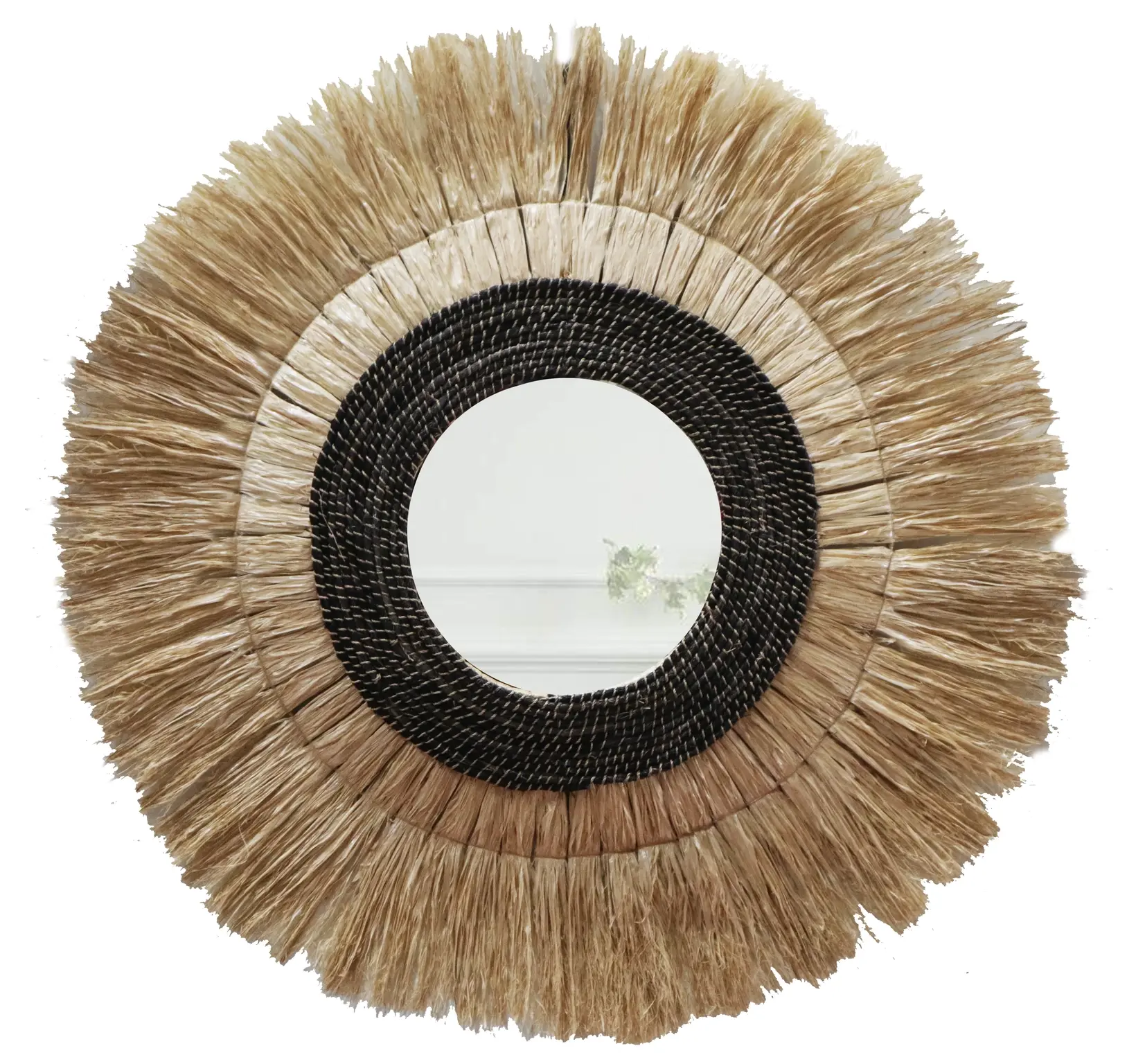 De Spiegel Kedu Rond - 93 cm is gemaakt van raffia en past perfect in de natuurlijke en warme bohemian stijl.