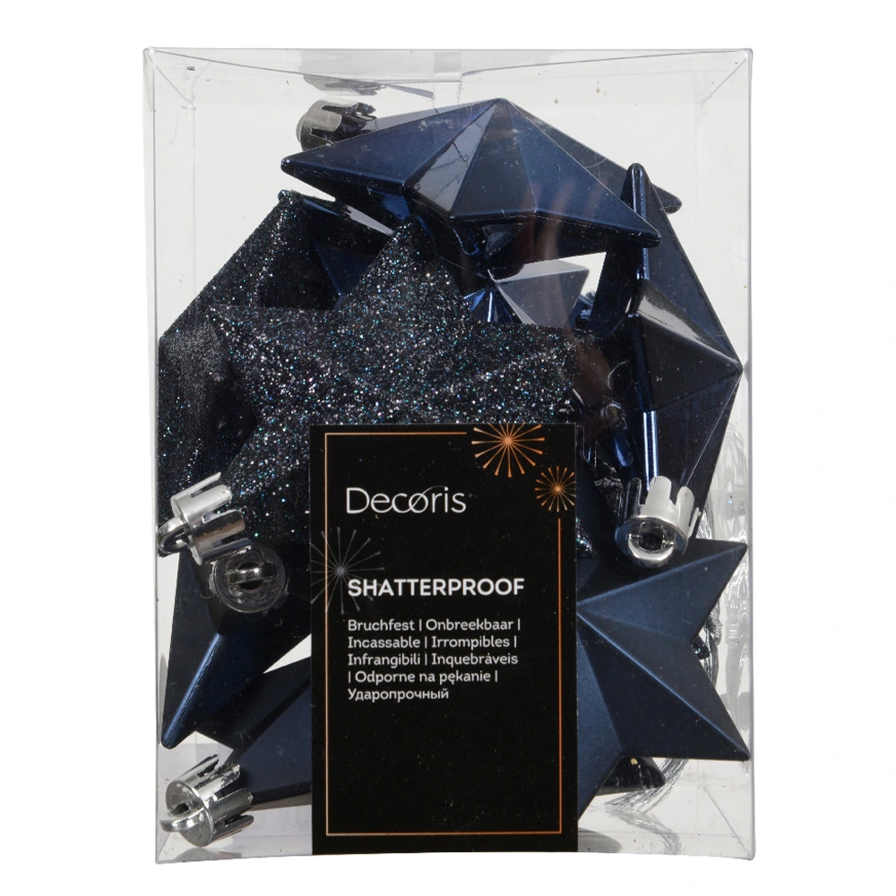 Creëer een unieke kerstboom met de Sterren Mix 12 st. - Nachtblauw van Decoris! Deze plastic kersthangers zijn een echte eyecatcher in de boom. De kersthanger is gemaakt van kunststof en dus ook veilig voor kinderen en huisdieren.