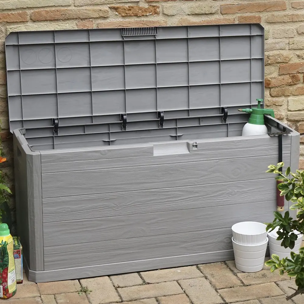 De Toomax Kussenbox Woody's Warm Grijs - 280 L is een praktische en veelzijdige opbergbox, ontworpen om kussens en andere buitenspullen op te bergen. Deze kussenbox biedt voldoende opbergruimte en gemakkelijke toegang. Gemaakt van kunststof, is hij bestand tegen verschillende weersomstandigheden en eenvoudig te onderhouden. Bovendien kan de kussenbox afgesloten worden (slot niet inbegrepen), waardoor je waardevolle spullen veilig kunt bewaren.