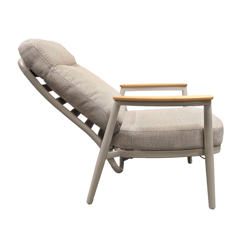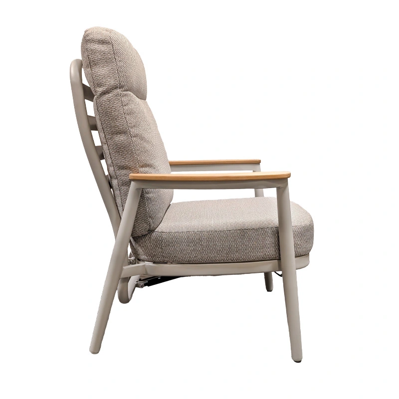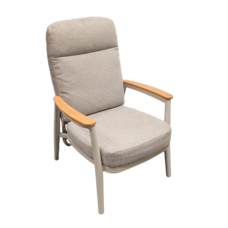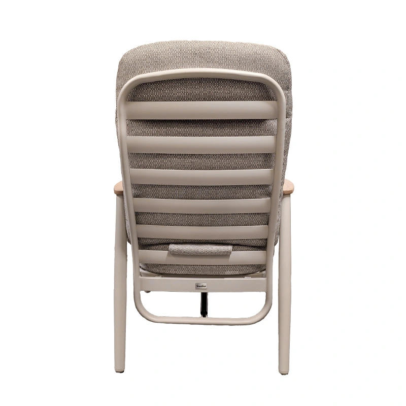 Geniet optimaal van lange avonden in de tuin met de Trestino Alassio Verstelbare Diningstoel - Latte. De stoel combineert een stevig aluminium frame met stijlvolle teak armleuningen, wat zorgt voor een moderne en warme uitstraling.