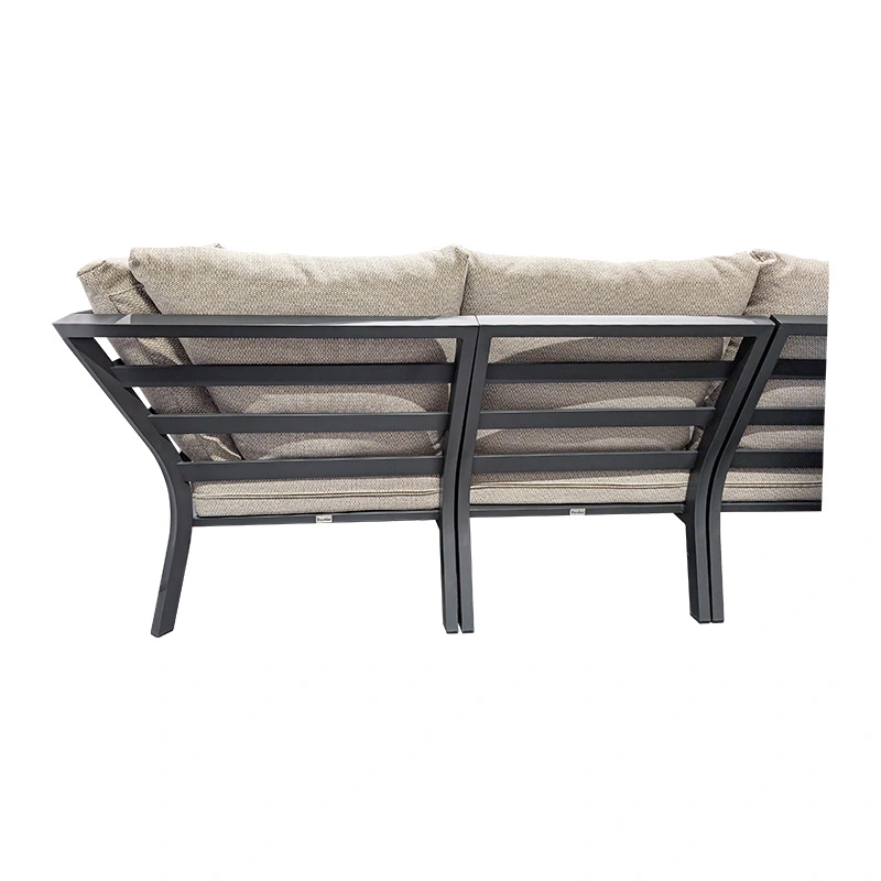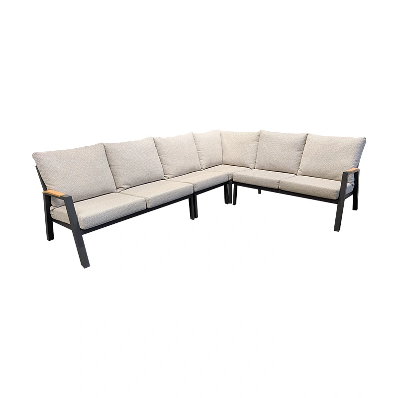Deze hoekbank bestaat uit 4 delen en wordt geleverd inclusief stevige zit- en rugkussens. Het frame van de loungebank is gemaakt van aluminium gecombineerd met teakhouten armleggers.