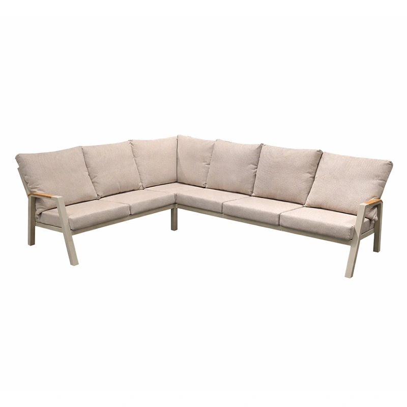 Deze hoekbank bestaat uit 4 delen en wordt geleverd inclusief stevige zit- en rugkussens. Het frame van de loungebank is gemaakt van aluminium gecombineerd met teakhouten armleggers.