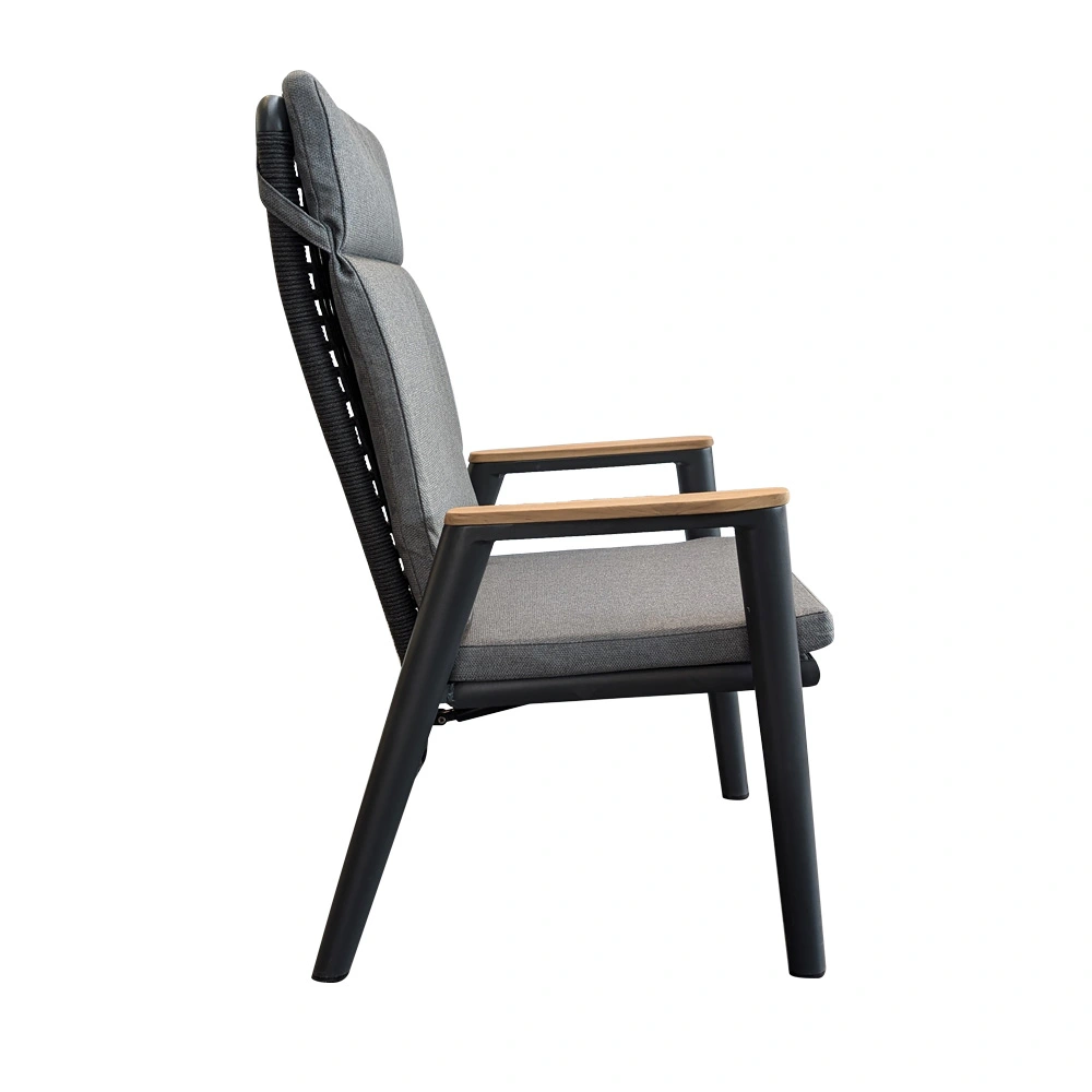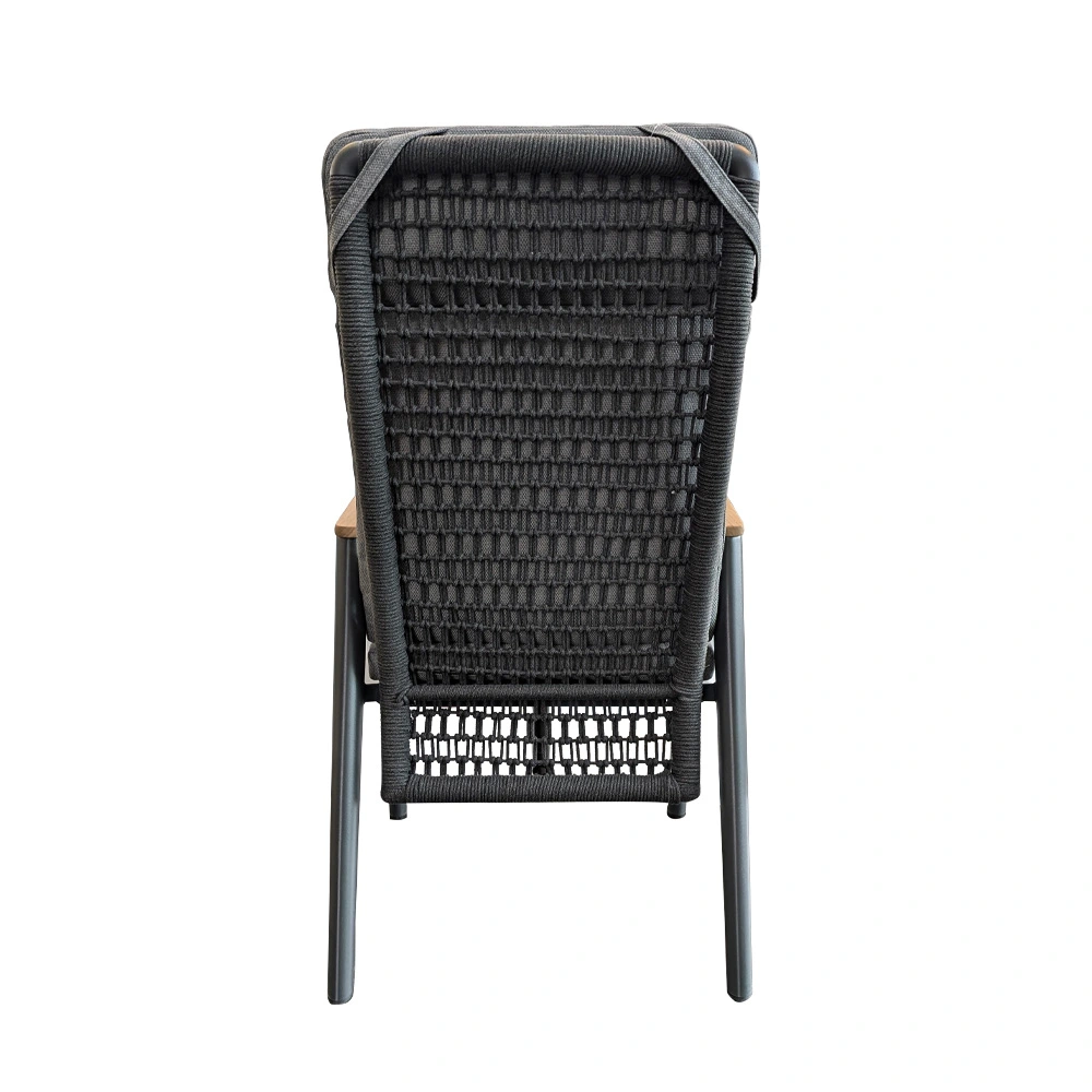 De tuinstoel heeft een aluminium frame en een rugleuning en zitting van rope.