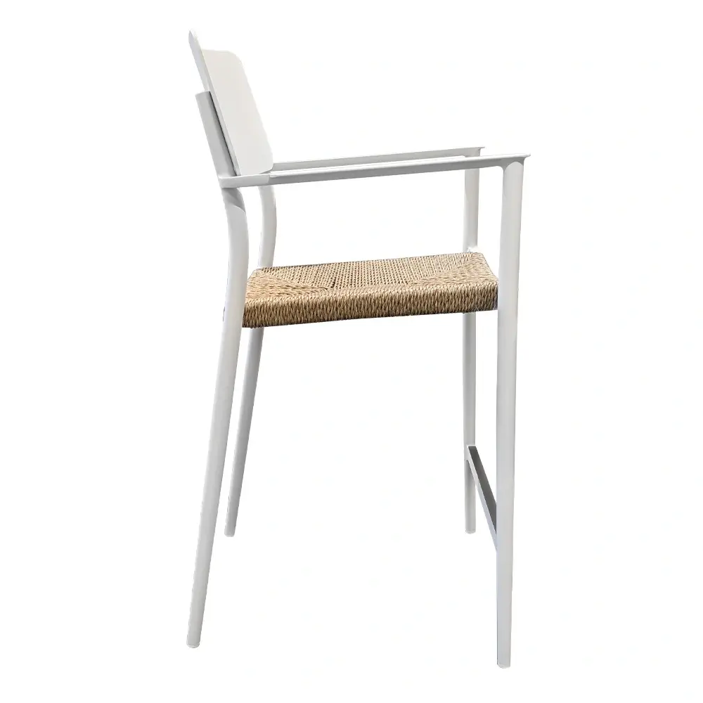 De Trestino Elmas Esta Barset - Wit bestaat uit een outdoor bartafel die perfect is voor gebruik in de tuin. De bartafel is gemaakt van aluminium met een tafelblad van teak. Daarbij horen 4 moderne barstoelen met een stevig aluminium frame en zijn omwikkeld met rope.