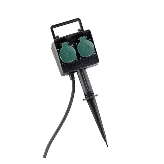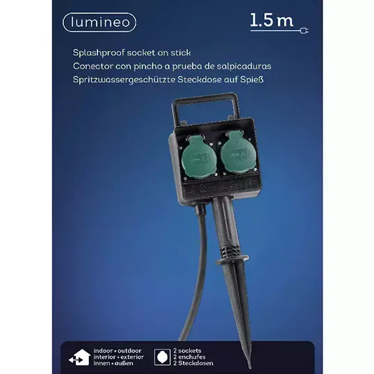 De contactdoos is voorzien van 2 spatwaterdichte stopcontacten met beschermhoesjes. Het aanloopsnoer heeft een lengte van 1,5 meter.