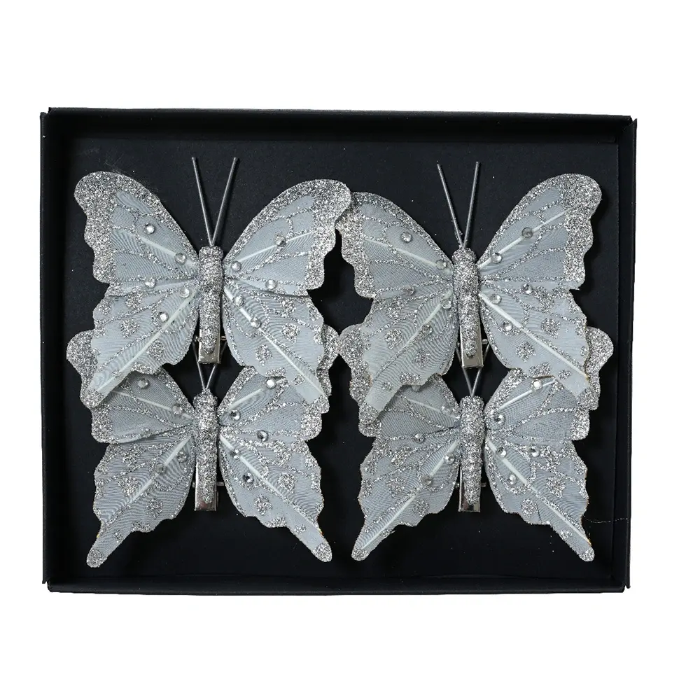 Creëer een unieke kerstboom met de Vlinder op Clip Glitters Zilver - 4 st. van Decoris! Deze zilveren kerstclip is een echte eyecatcher in de boom. De kerstclip is gemaakt van kunststof en dus ook veilig voor kinderen en huisdieren.