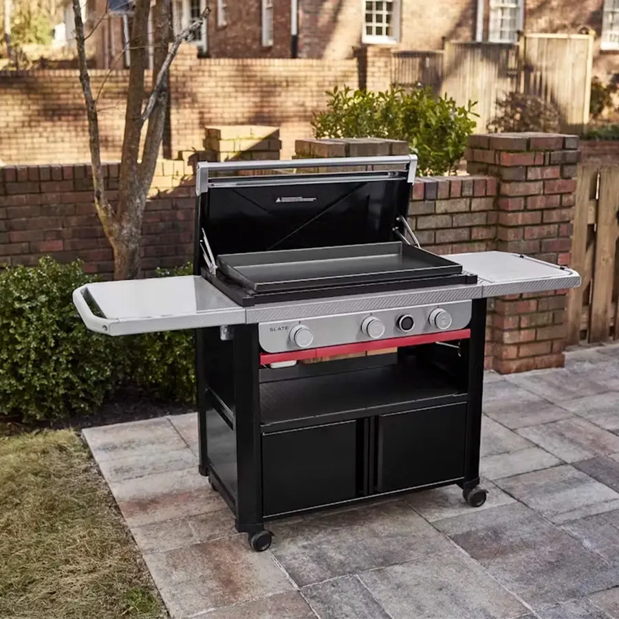 Heb meer plezier in het bakken op de Weber SLATE Plancha Premium - 76 cm. De grote bakplaat bereikt een temperatuur van meer dan 260 °C en wordt van rand tot rand gelijkmatig heet, zodat je eten gelijkmatig gaar wordt, ongeacht waar je het op de bakplaat plaatst. De met porselein geëmailleerde bakplaat met anti-aanbaklaag is direct klaar om op te bakken, zodat je sappige 'smashed' burgers, smakelijke wokgerechten, prachtig gegrilde vis, groenten en meer kunt maken. Bovendien kun je met het Weber Works werkruimte-, kook- en opbergsysteem je gereedschap en schoonmaakbenodigdheden bij de hand houden, etenswaren en kruiden van de keuken naar de bakplaat dragen, de zijtafel omtoveren tot extra werkruimte en je barbecuetools opbergen in goed afgesloten opbergboxen (accessoires apart verkrijgbaar).