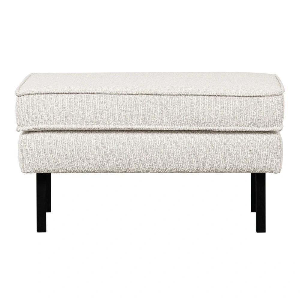De Rodeo hocker is opgebouwd uit een combinatie van massief hout [fsc], spaanplaat [fsc], polyurethaan schuim met een dichtheid van 25 kg/m3 en een zigzag vering. De zitting bevat een polyurethaan schuim met een dichtheid van 30 kg/m3 (HR3532). Deze Rodeo is bekleed met een zachte bouclé. Het materiaal van de Colmar bouclé stof speelt in op de laatste trend: zachte materialen. De stof is comfortabel en heeft een elegante textuur. deze Colmar bouclé heeft een Martindale van 100.000, dat betekent dat de stof geschikt is voor intensief gebruik. De dichte weeftechniek zorgt voor de sterkte van de stof, dit maakt dat de bouclé niet snel zal slijten of scheuren. Ook heeft elke kleur een hoge kleurvastheid, maar het is aangeraden om direct zonlicht te vermijden om kleurnuances te voorkomen.