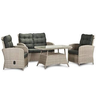 Prachtige loungeset van Your Own Living, bestaande uit een 2-zits bank, 2 royale fauteuils en een grote dining tuintafel met glasplaat. De fauteuils van de Moldes loungeset hebben een verstelbare rugleuning waardoor je er extra lekker in kan relaxen. De bank en fauteuils worden standaard geleverd met een stevig rug- en zitkussen voor optimaal comfort. De Moldes set is gemaakt van een mooie mix van off white en grijs materiaal, de gecapitonneerde rugkussens geven de set een klassieke uitstraling. Met deze gezellige, luxe loungeset zit je deze zomer zeker goed!